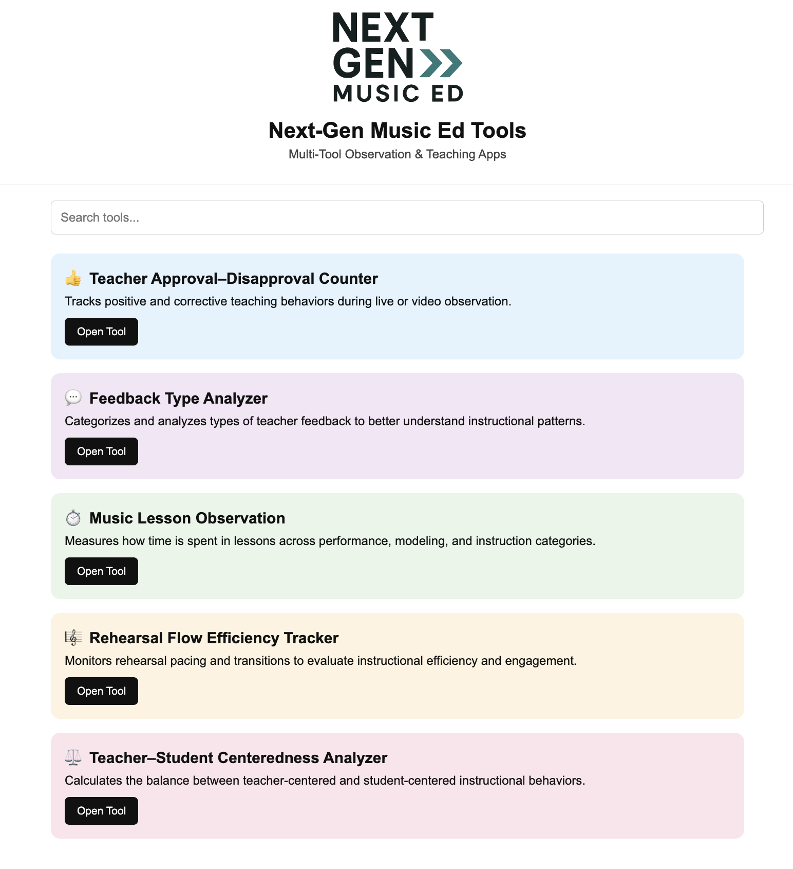 By making teaching practices visible and measurable, the tools support more intentional, student-centered instruction and more efficient rehearsal design. Each app runs in any web browser, requires no installation, and is easy to use in classrooms, field experiences, or teacher education programs.